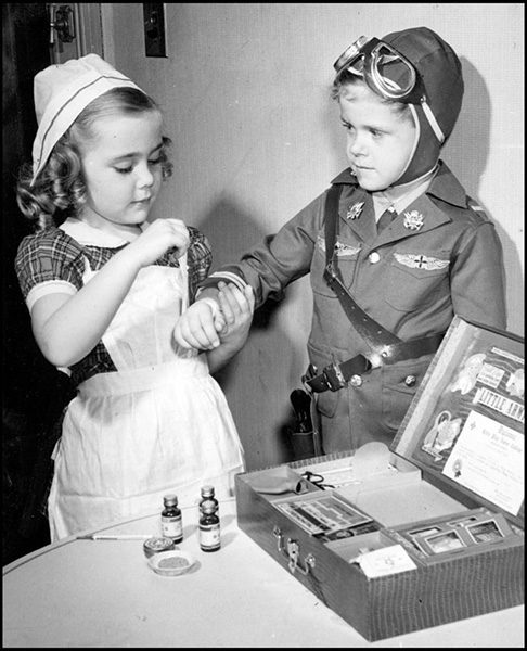 4. Дети играли игрушечными пистолетами, шлемами, униформой, воображая себя солдатами в бою. Среди игр было немало старых и новых, адаптированных к теме войны. Актуальны были двуязычные игры, с помощью которых канадцы англоязычной и франкоязычной части страны могли объединиться.