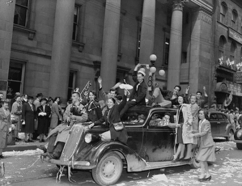Поринути в цю атмосферу легко, просто уявіть молодий хлопець біжить вулицями міста і кричить: «Вже кінець!», сусідні магазини, прості перехожі підхоплюють цей радісний крик. Варто додати, що містяни не одразу змогли усвідомити цю звістку, адже війна в Європі тривалістю 5 років 8 місяців та 6 днів закінчилася. Близько години жителі міста усвідомлювали це, проте у міру поширення новин вже почалося серйозне святкування.